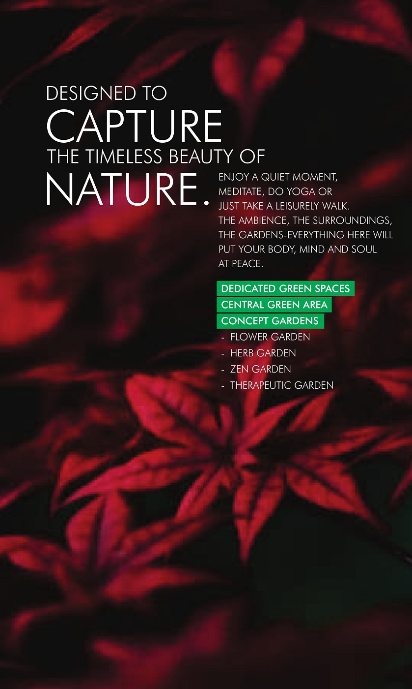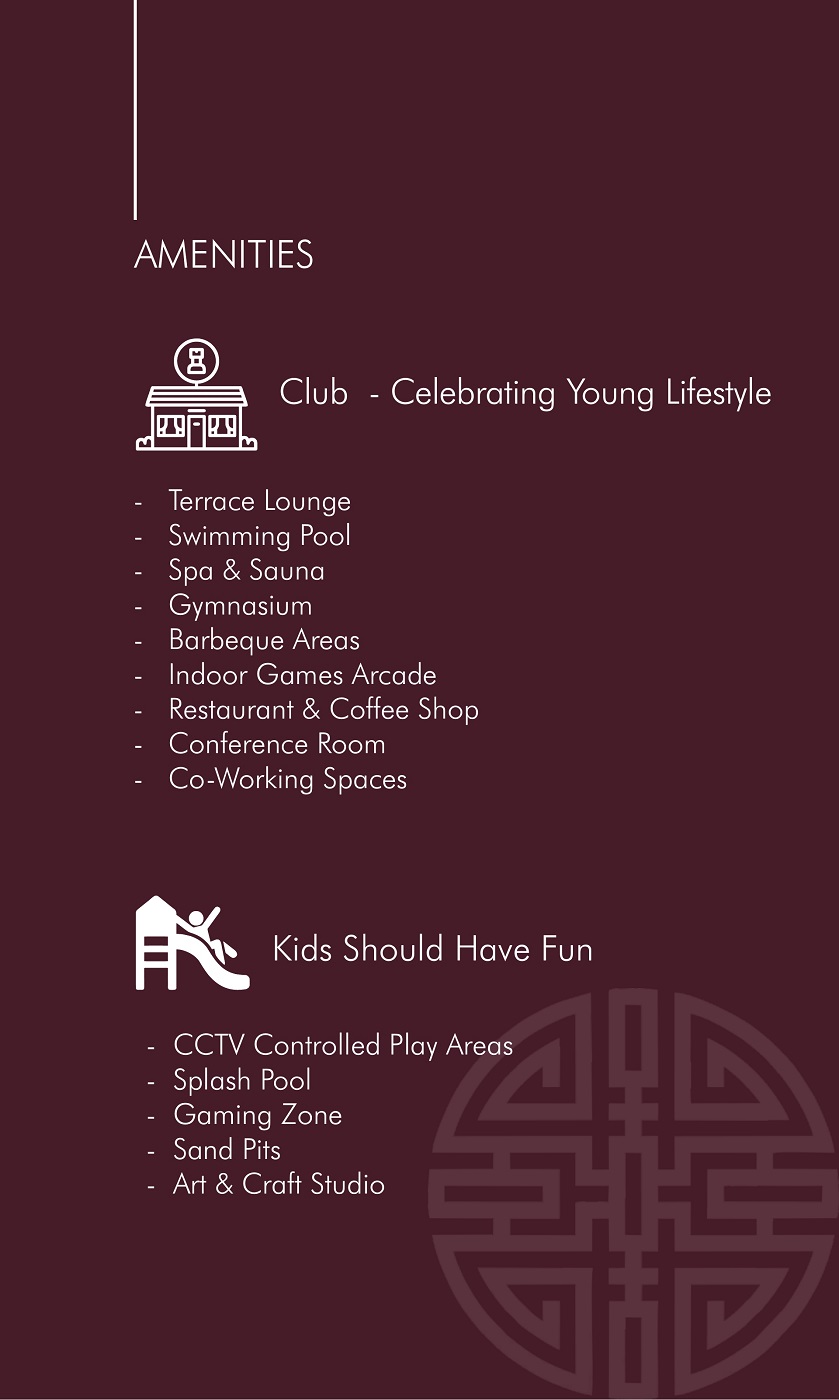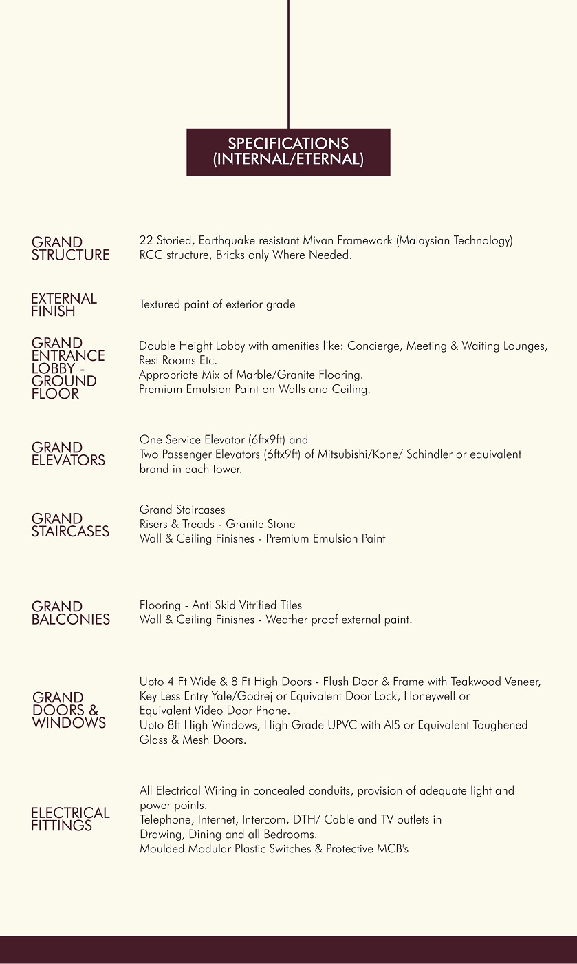 INDEPENDENT TOWERS - ALL FLATS ARE CORNER FLATS - DESIGNED FOR AMPLE SUNLIGHT AND NATURAL VENTILATION - DEDICATED LOBBIES FOR EVERY TOWER WITH DROP OFF POINT - FIRST TIME IN TRI-CITY - DOUBLE HEIGHT PODIUM PARKING