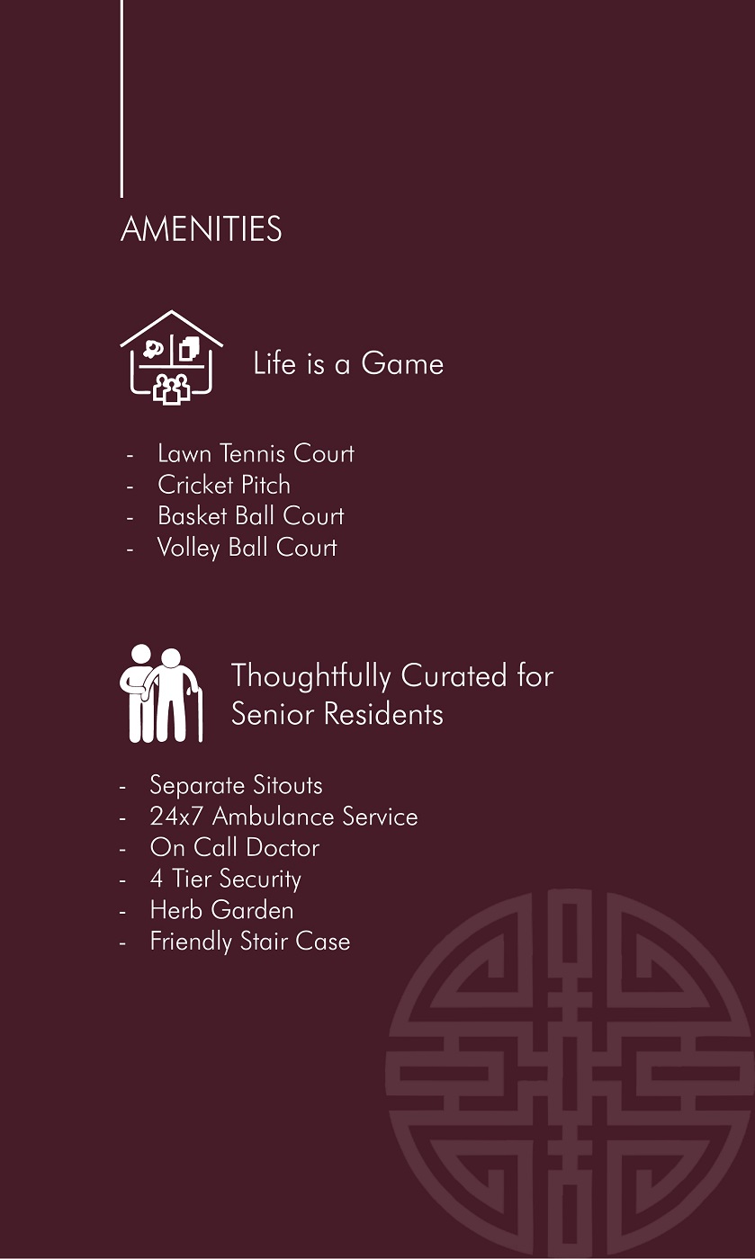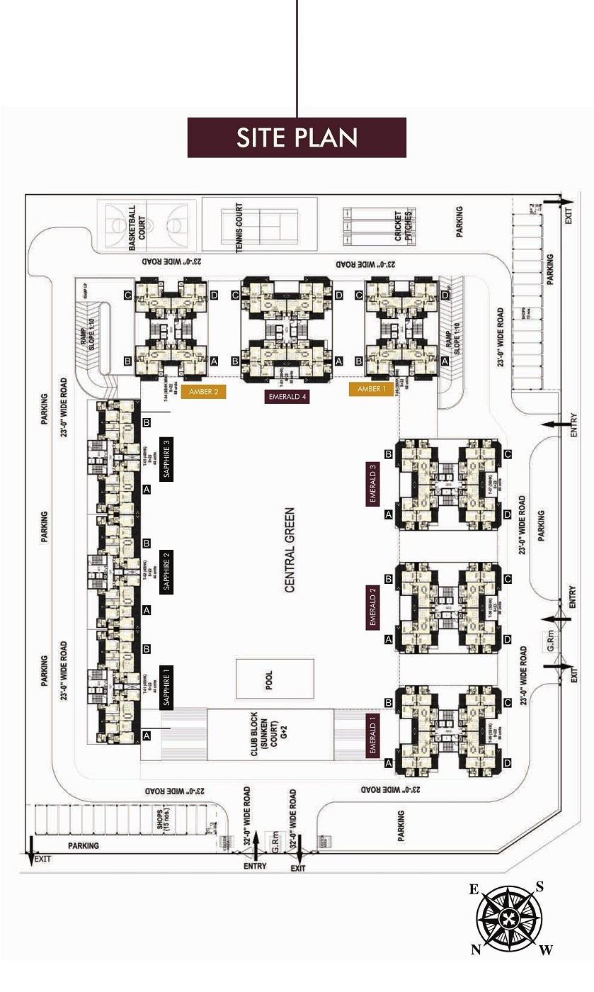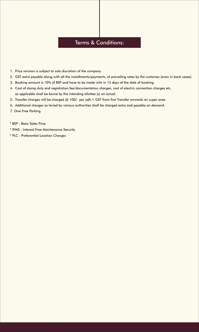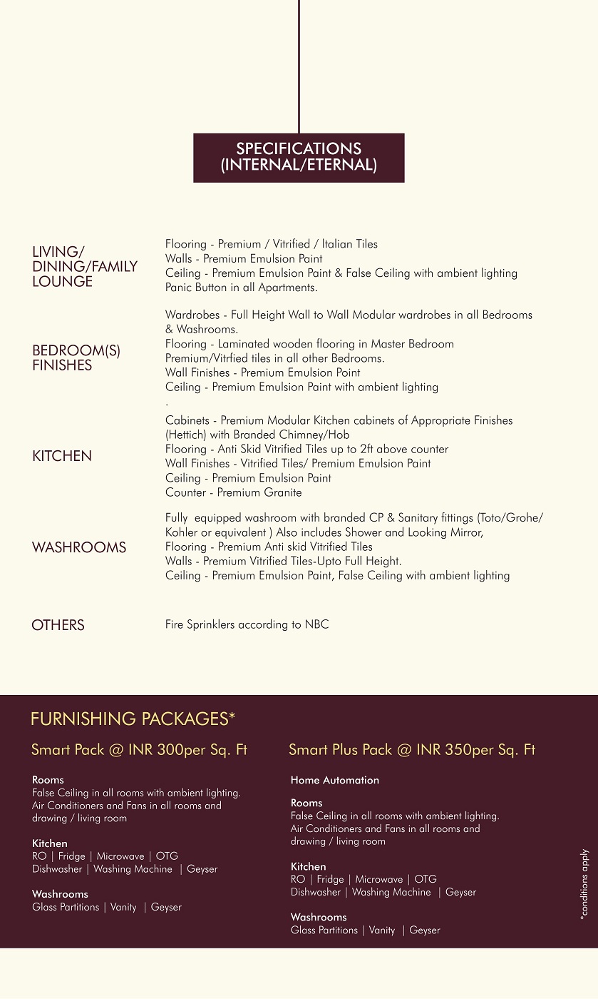 INDEPENDENT TOWERS - ALL FLATS ARE CORNER FLATS - DESIGNED FOR AMPLE SUNLIGHT AND NATURAL VENTILATION - DEDICATED LOBBIES FOR EVERY TOWER WITH DROP OFF POINT - FIRST TIME IN TRI-CITY - DOUBLE HEIGHT PODIUM PARKING